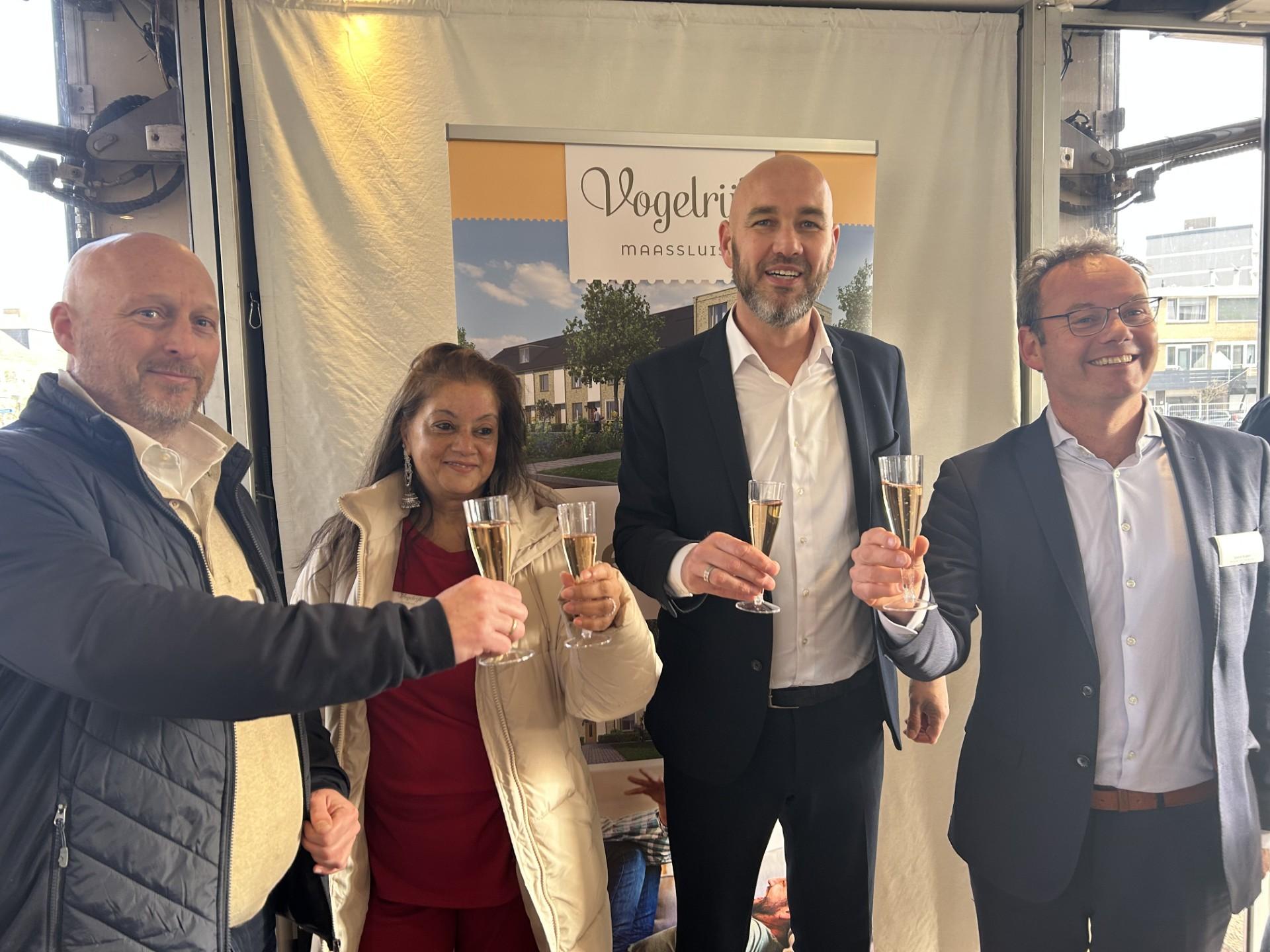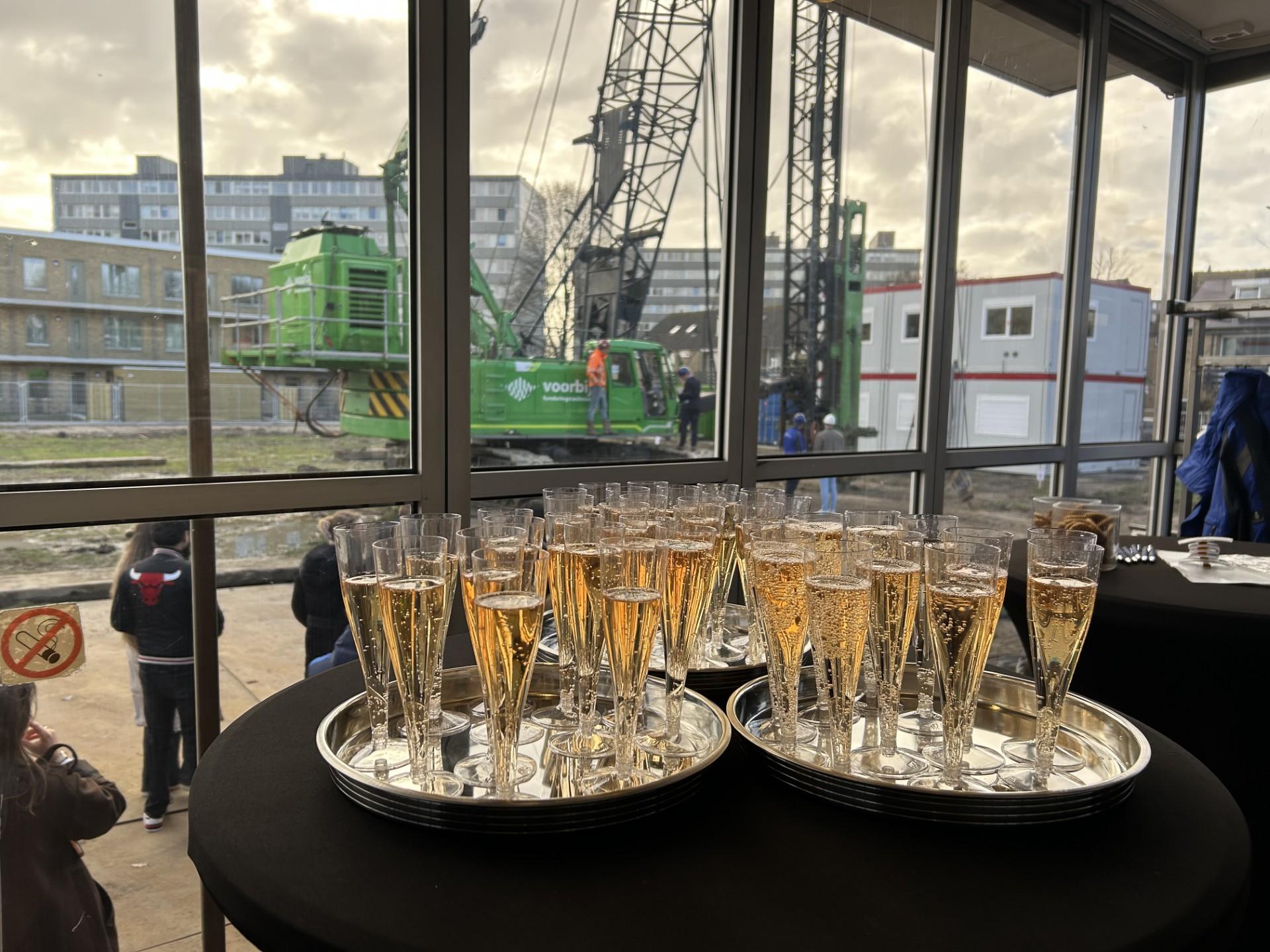 Daarna was het tijd voor een glas bubbels om gezamenlijk te proosten op de start van de bouw van de woningen en kregen de kopers de gelegenheid elkaar te leren kennen en te spreken met de projectpartners.