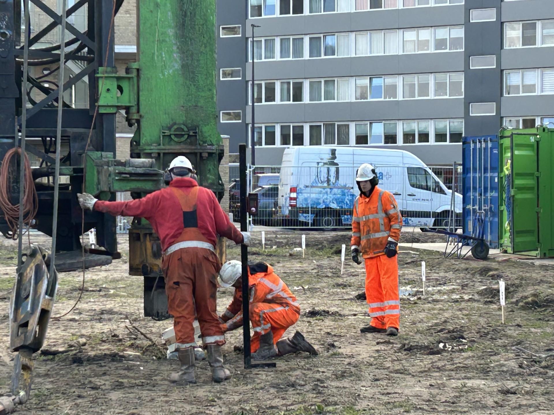 Hij vertelde over de bouw en de planning en nam vervolgens de aanwezigen mee naar buiten voor de symbolische handelingen. De kopers van bouwnummer 6 mochten het hei-team helpen bij het heien van de laatste paal van hun woning.