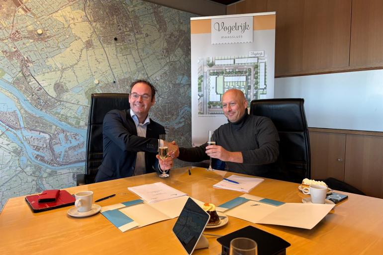 Wethouder Kuiper van de gemeente Maassluis en  Sander Aalpol, directeur van Kalliste, hebben vandaag beiden hun handtekening gezet onder de overeenkomst voor de ontwikkeling en realisatie van nieuwbouwproject Vogelrijk.