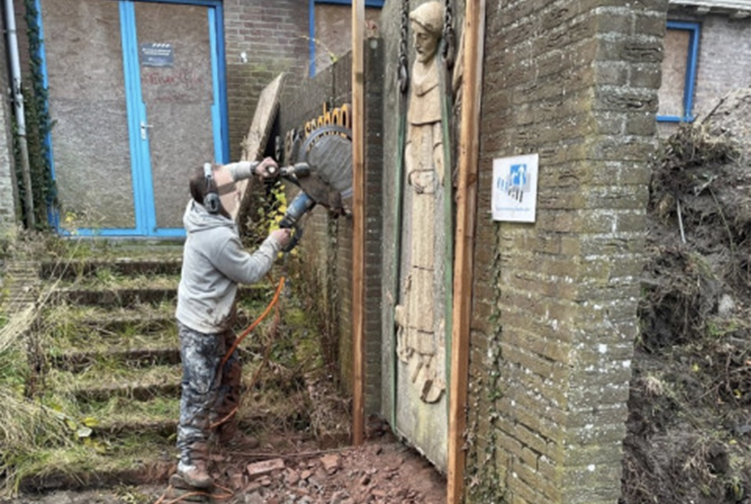 Afgelopen vrijdag 12 november is het keramisch reliëf met daarop de afbeelding van Sint Bernardus zeer zorgvuldig uit de muur van de oude Bernardusschool gezaagd.
