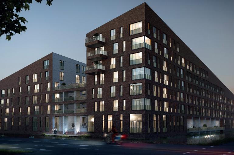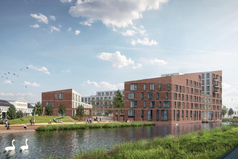 Opzet van het plan: In de ligging tussen een straat met twee- à drielaags woningen en woonblokken tot zes lagen is aanleiding gevonden om het volume op een bijzondere manier vorm te geven. Aan de noordelijke stadsas vormt het gebouw een hoge wand die het intieme binnengebied in de luwte houdt. Zo ontstaat een geschikt woonmilieu zonder weg- en verkeerslawaai. De zon wordt juist binnengehaald door het volume op te knippen richting het zuiden en lager te maken. Aan twee zijden staat het gebouw in het water, dat extra kwaliteit aan de appartementen geeft. Aan de kant van de Waterwijk maken we een typologische verbinding, door een blok twee- en drielaags appartementen tegenover de eengezinswoningen te zetten die daarmee samen een straatje vormen. Dat maakt het een divers en rijk plan, waarin je zowel aan het water, aan een binnenhof als in een gezellige straat kan wonen.